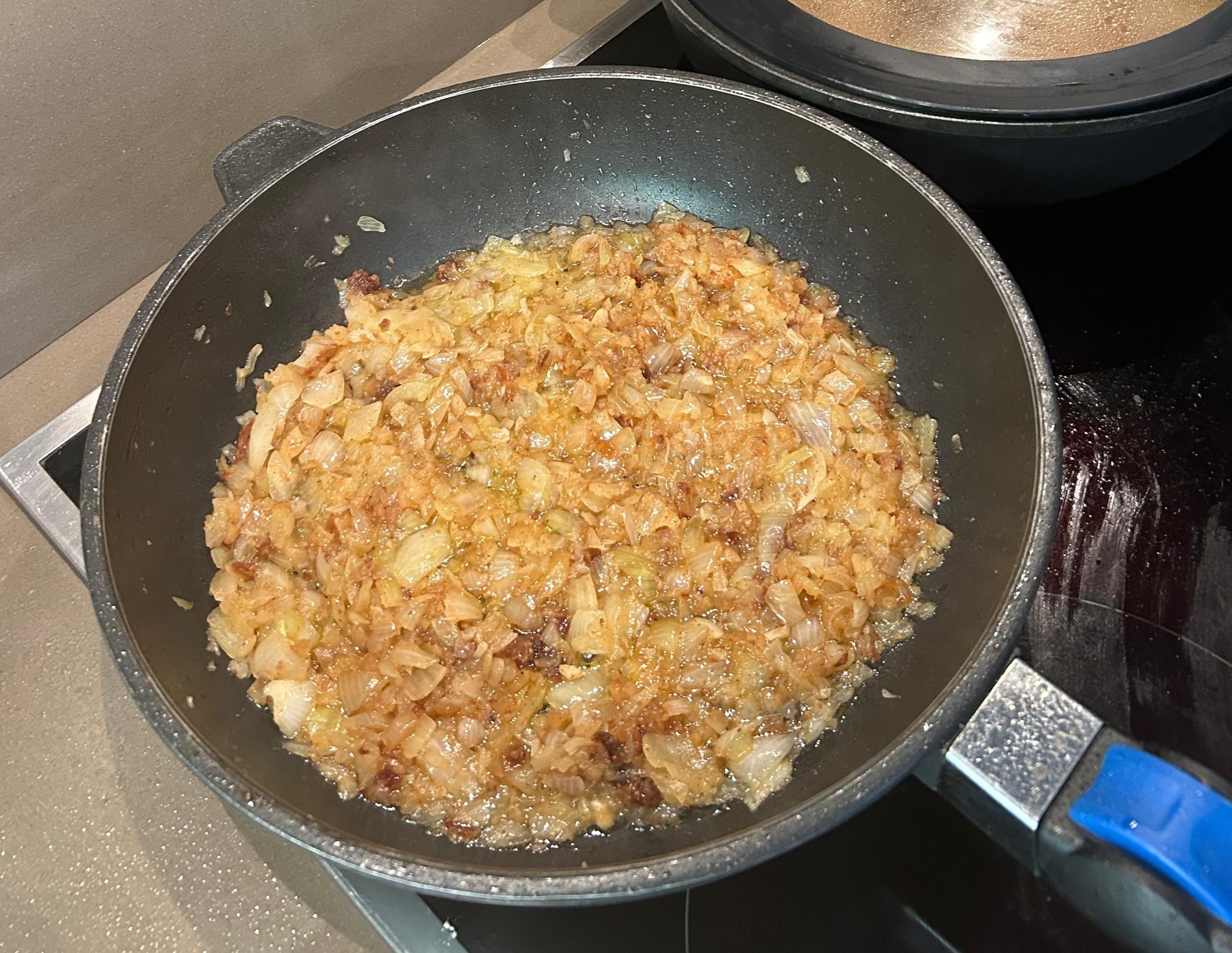 - Sofregeix la ceba i un cop estigui ben caramel·litzada desglaça amb el vi i/o el licor. Deixa que evapori l’alcohol i incorpora-hi el tomàquet ratllat. Sofregeix tot junt a foc suau perquè es concentrin tots els sabors.