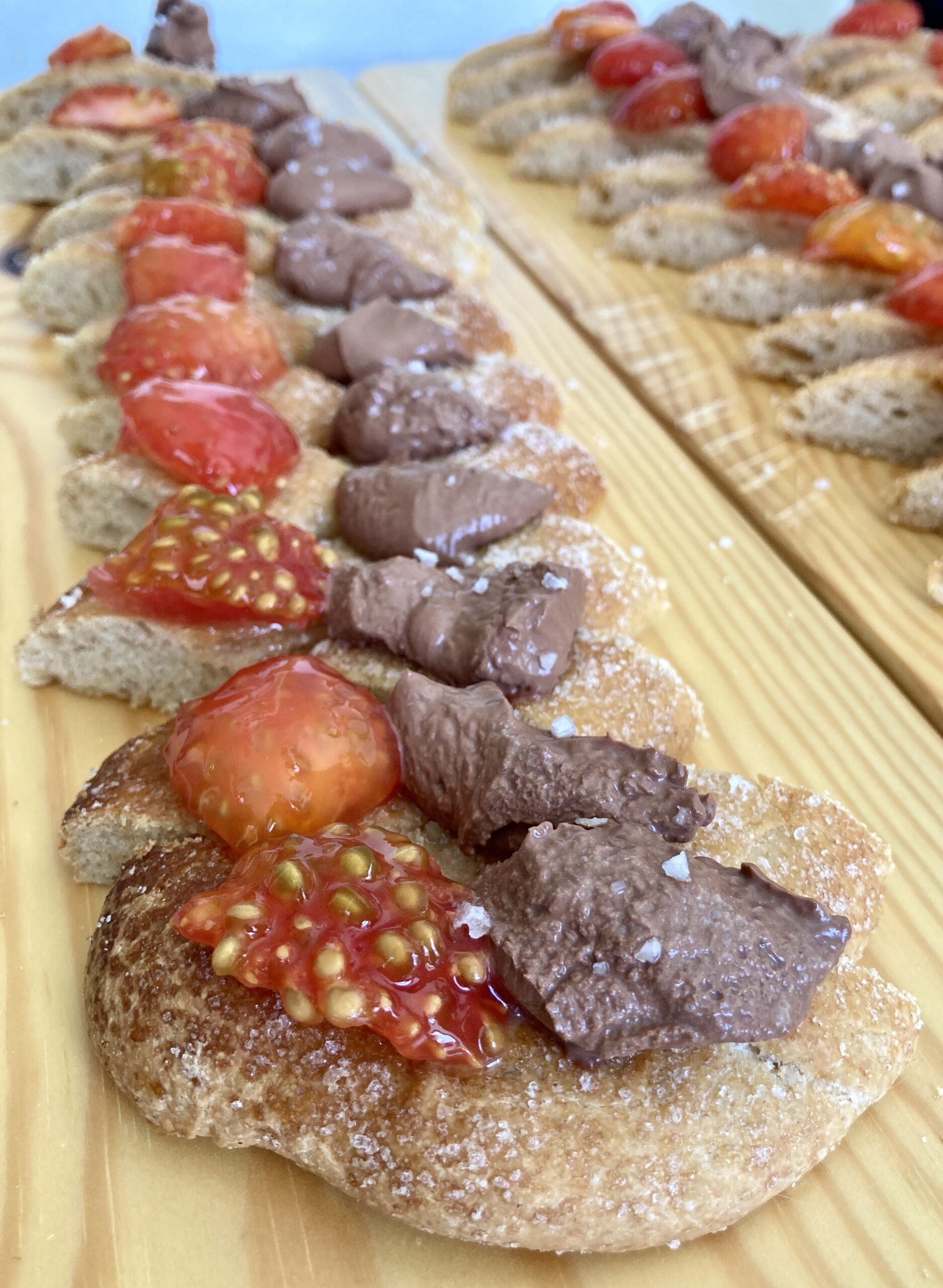 - Alterna de forma aleatòria, però una mica estètica, llavors de tomàquet i puntets de ganache xocolata que pots fer amb la màniga o una cullera si no tens màniga. Acaba amb un fil d’oli d’oliva verge extra i unes escates de sal. Bon profit!