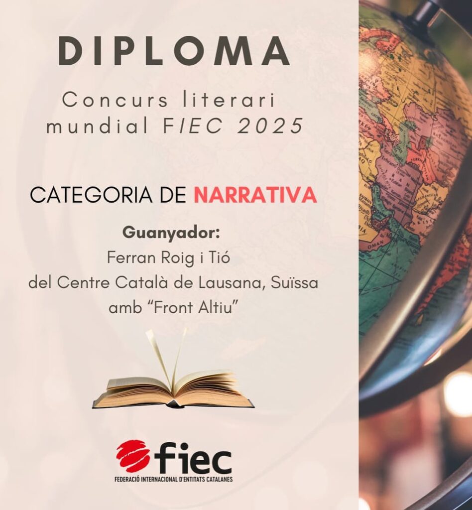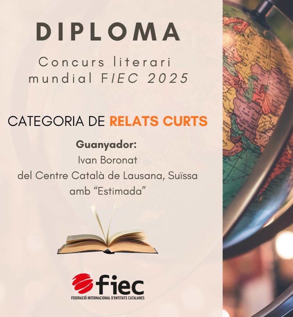 El passat divendres es van anunciar els guanyadors del 4t Concurs literari mundial organitzat per la FIEC (Federació Internacional d’Entitats Catalanes). Hi participen els guanyadors dels concursos literaris de cada continent i el Centre Català de Lausana hi tenia dos representants, en Ferran Roig i l’Ivan Boronat, que havien guanyat el concurs europeu en les categories de narrativa i relat curt respectivament.
